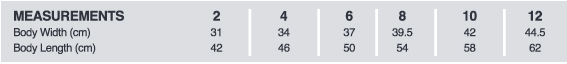 | Body Width (cm) | 31 | 34 | 37 | 39.5 | 42 | 44.5 | 47 | 49.5 |
